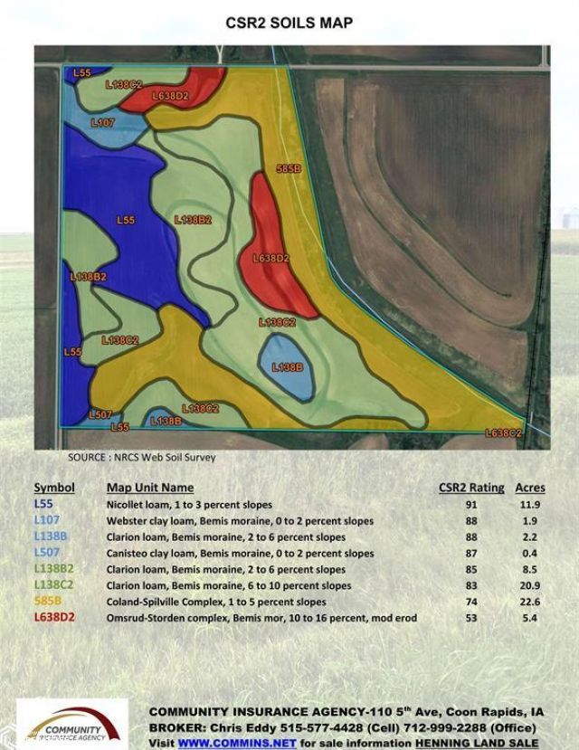 Excellent Greene County farm priced to sell! Good cropping history, farmed with minimum tillage and corn/soybean rotation. Conservation management practices include terraces and CRP. Drainage ditch was dredged in 2020. New owner(s) may have the option to install a saturated buffer through partnership with the Iowa Soybean Association. Excellent wildlife habitat offers great hunting potential. Close proximity to several grain receiving facilities including NEW co-op, Landus, Poet Biorefining and Louis Dreyfus Company. This farm would make a great building site and lies within close proximity to nearby Raccoon River Valley Bike Trail. Visit WWW.COMMINS.NET and visit the 'real estate' tab under Henning Land Sale.